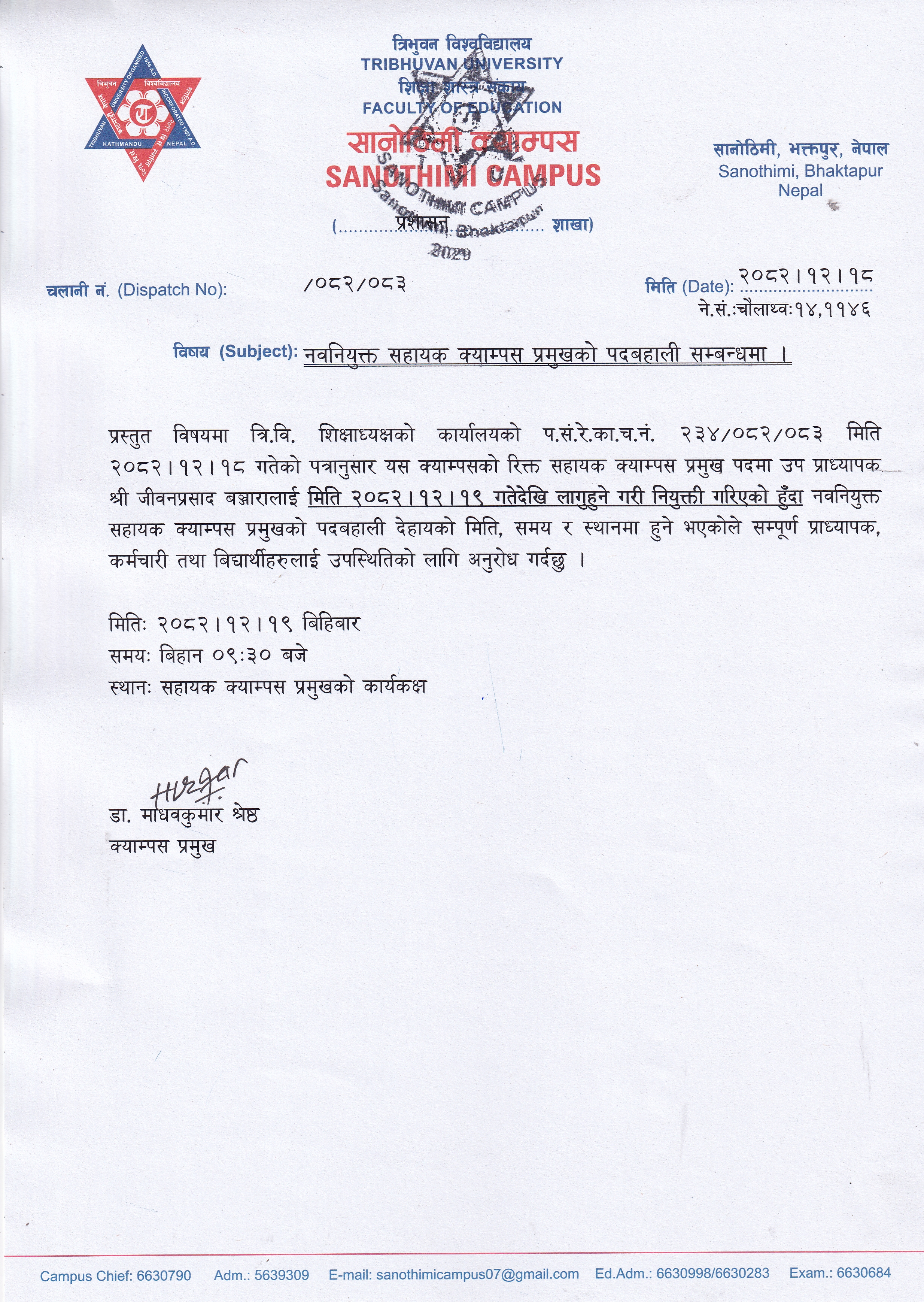 नवनियुक्त सहायक क्याम्पस प्रमुखको पदबहाली सम्बन्धमा