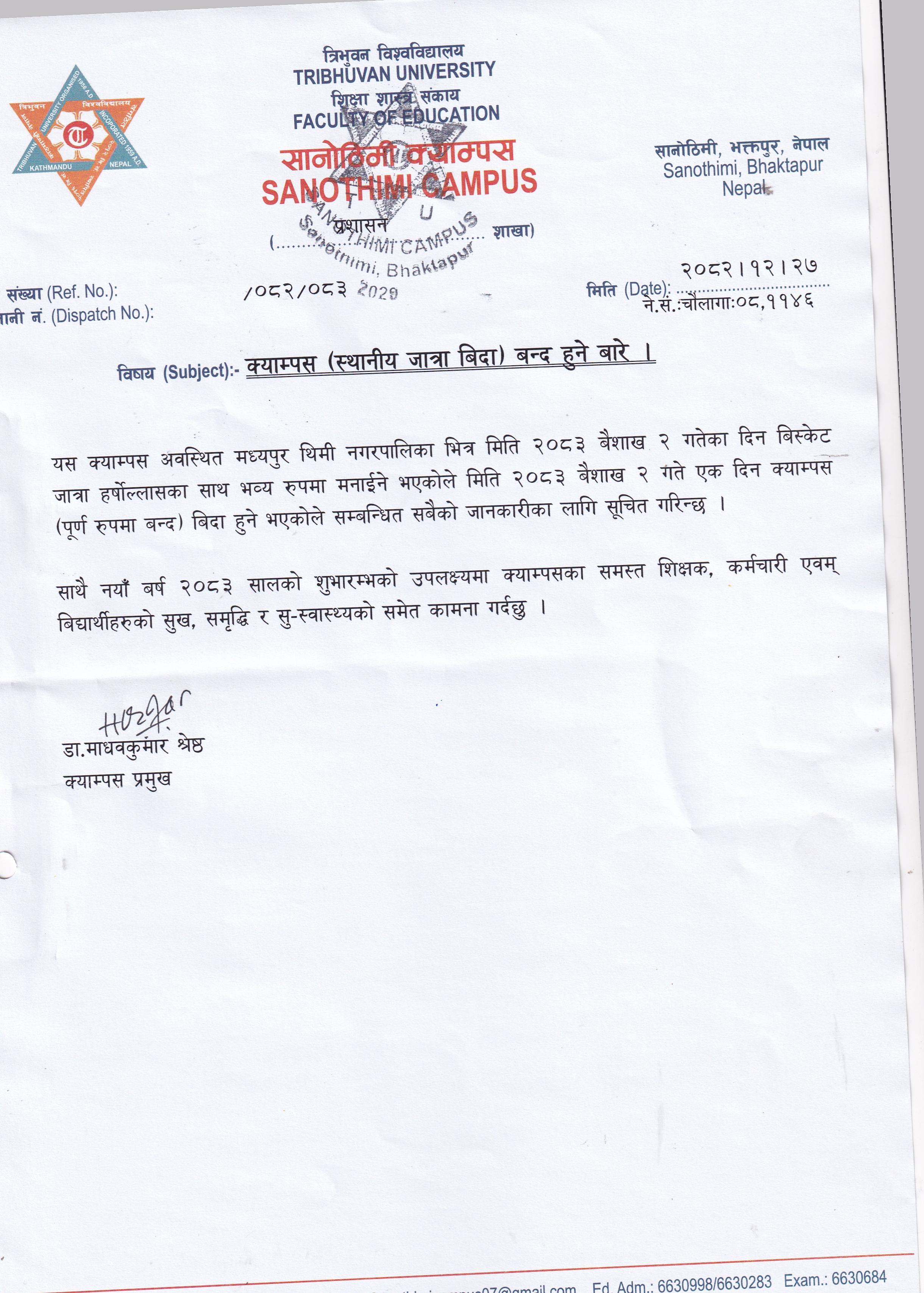 क्याम्पस (स्थानीय बिदा) बन्द हुने बारे ।